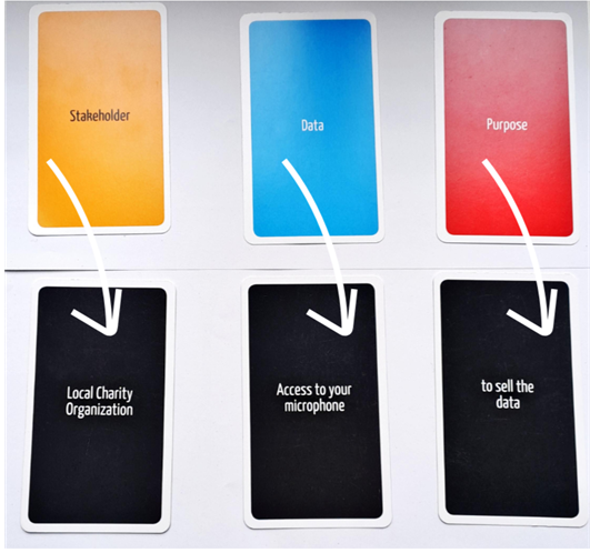 Abbildung 2: Beispiel für eine gezogene Karten-Kombination: Eine lokale Wohltätigkeits-Organisation möchte Zugriff auf dein Mikrofon um die Daten zu verkaufen.